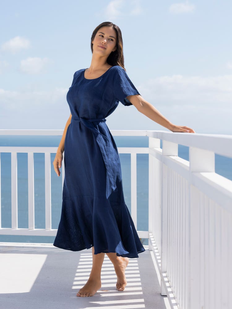 लेडी मैक्सी लंबी बांह की सुरुचिपूर्ण लिनन पोशाक विवरण